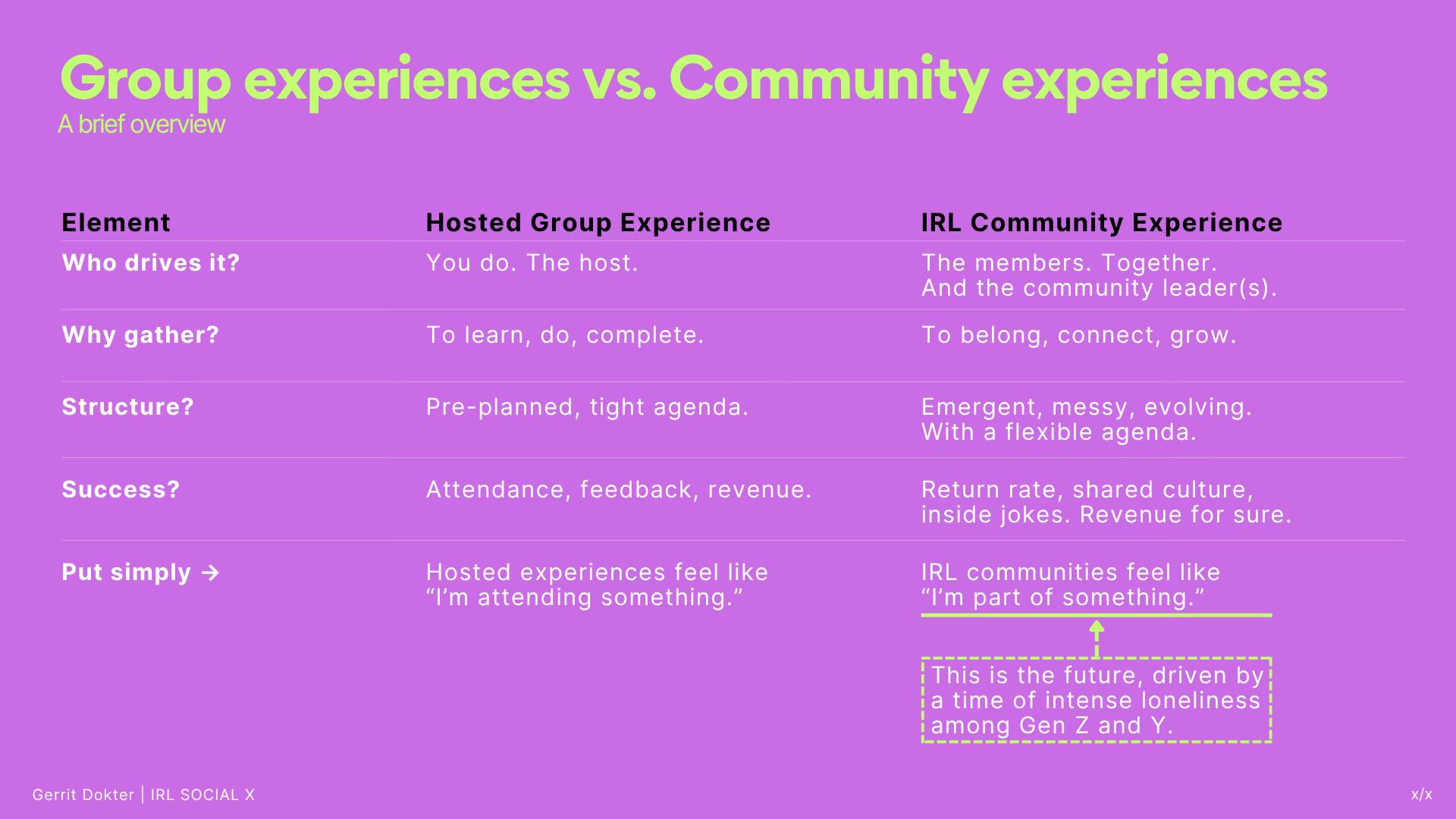 Hi, I’m Gerrit, an IRL Community Builder. Right now, a lot of creators, facilitators, brands, and organizers are stuck in the “hosted experience” loop. You deliver something polished and meaningful, like a beautiful dinner, a purposeful retreat, a tactical workshop. You might even sell out.